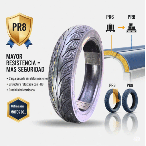 - Índice de 8 Lonas (8PR): Proporciona una resistencia excepcional a los impactos y una alta capacidad de carga.