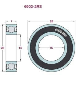 Rodamiento rígido de bolas con dimensiones internas y externas estandarizadas (6902). La designación “2RS” indica que está sellado en ambos lados con retenes de goma para proteger contra el polvo y la humedad. Ideal para diversas aplicaciones mecánicas.